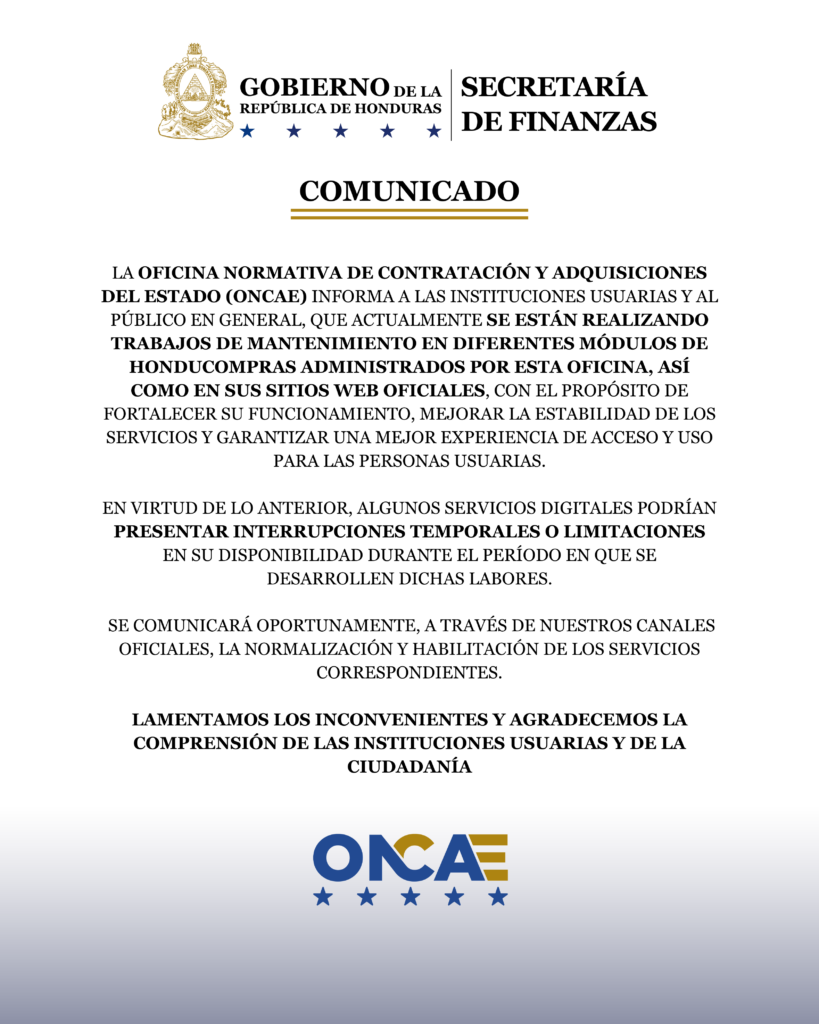 ¡COMUNICADO! MANTENIMIENTO EN DIFERENTES MÓDULOS DE HONDUCOMPRAS.